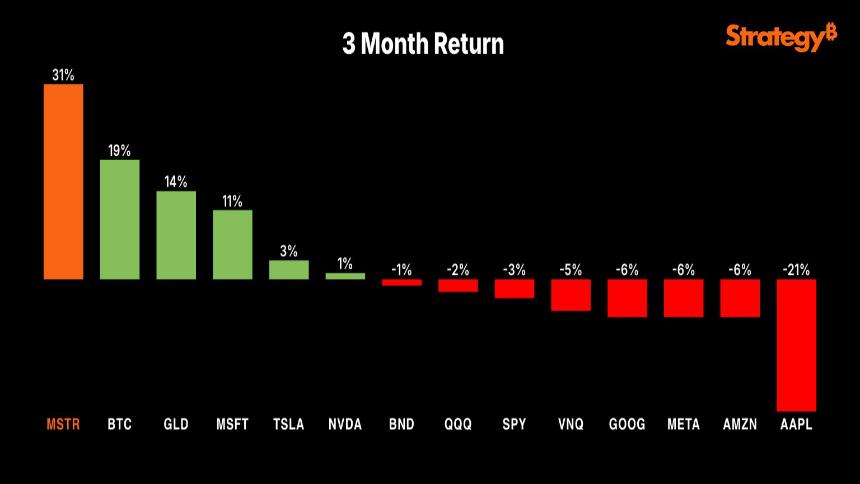 Michael Saylor发布投资回报率图表:MSTR表现优于比特币及主流科技股 摘要 2025年5月24日,迈克尔·塞勒(Michael Saylor)发布了两张业绩图表,比较了主要资产三个月和一年的回报率。这篇帖子分享在他的X账户上,并配文称…… 。 币圈财经笔记报道: 2025年5月24日,MicroStrategy联合创始人迈克尔·塞勒(Michael Saylor)在其...