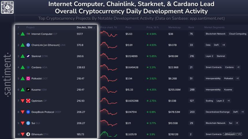 互联网计算机开发活跃度超越ETH和ADA,位居行业首位 币圈网报道: 最新数据显示,互联网计算机(Internet Computer, ICP)在开发活动指标中排名第一,成功超越了以太坊(ETH)和卡尔达诺(ADA)等主流加密货币。 互联网计算机领跑开发活动榜单 据分析公司 Santiment 在 X 平台上发布的一篇新文章,过去一个月加密领域的顶级项目...