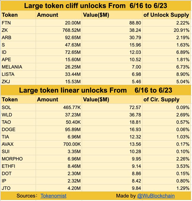 Fasttoken (FTN) 和 ZKsync (ZK) 领衔本周 4.43 亿美元代币解锁潮 币圈网报道: 根据计划,6 月 16 日至 6 月 23 日这一周将迎来总额超过 4.43 亿美元的代币解锁活动,数据来源:Tokenomist 数据。 在此次活动中,Fasttoken 和 ZKsync 成为大型悬崖解锁类别的领头羊,而 Solana 则在线性解锁类别中占据主导地位。 FTN 和 ...