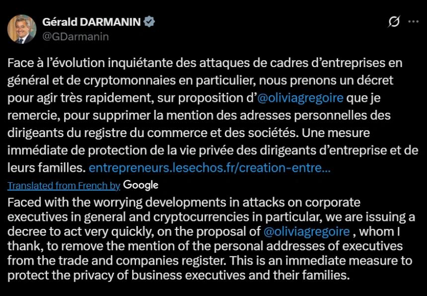 法国拟立法保护加密货币企业家免遭绑架威胁 币圈网报道: 法国正积极推进一项旨在加强加密货币企业家安全的新法案,以应对近期接连发生的绑架事件。 该立法举措出台之际,正值多起针对加密货币行业高管的绑架案件进入调查阶段。法国当局正在努力遏制今年席卷法国及其加密货币领域的暴力浪潮。 法国官员忙于应对大胆绑架事件 过去几个月,针对加密货币领域高管及其...