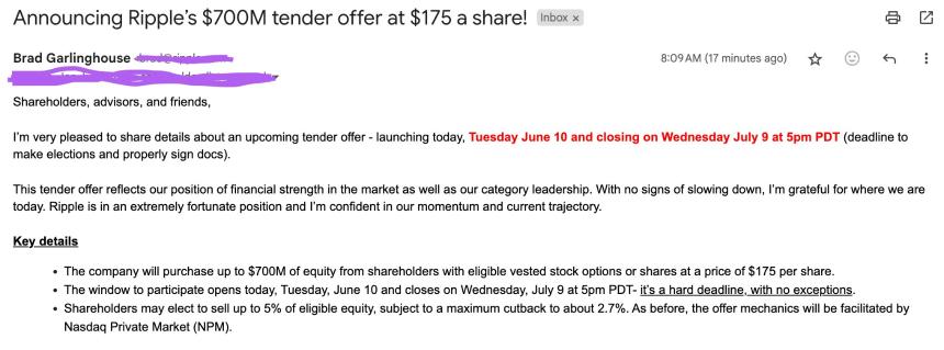 Ripple宣布以每股175美元价格回购7亿美元股票,彰显财务实力与增长信心 币圈网报道: 全球领先的区块链公司Ripple近日宣布,将以每股175美元的价格向股东发出总额达7亿美元的股票回购要约,这一举措被解读为公司对其未来增长潜力的高度信心。 知名投资者杰里米·雷珀(Jeremy Raper)在社交媒体平台X上分享了这一消息,并展示了Ripple首席执行官布拉德·加林豪斯...