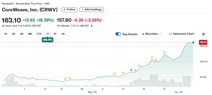 Coreweave股价创新高,CRWV会成为新的模因股票吗? 币圈网报道: Coreweave (CRWV) 股价在过去两个月持续上涨后,一度逼近 163.10 美元的历史高点。过去两个月,该股涨幅高达 500%,引发了人们对其估值过高的担忧。 Coreweave (CRWV) 继续上涨,创下新高,交易价报 163.10 美元。该公司此前受到英伟达在最近的 I...
