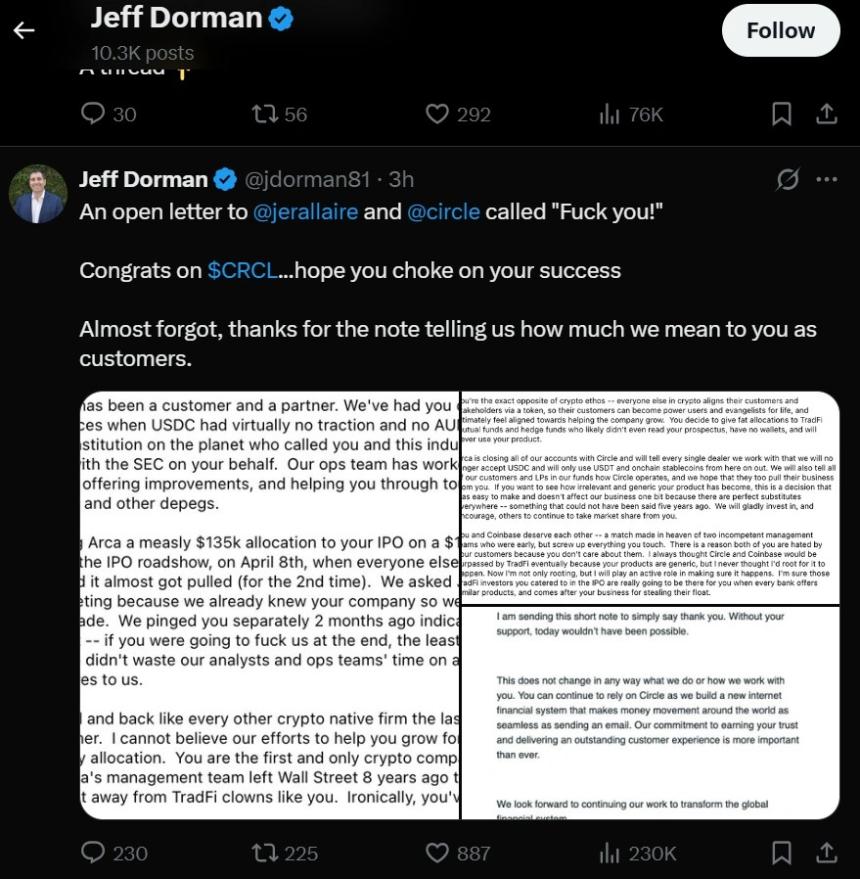 Arca 在 IPO 和纽约证券交易所上市后向 Circle 致以“最良好的祝愿”:“祝你成功” 币圈网报道: 圆圈 周四在纽约证券交易所的出色首秀迅速恶化,此前其长期合作伙伴和加密投资公司 Arca 公开抨击这家稳定币发行商,称其背叛了加密原生盟友,转而支持华尔街。 股份Circle稳定币 USDC 背后的公司 CRCL.N 开盘价为 69 美元,是其 31 美元 IPO 价格的两倍多,最高达...