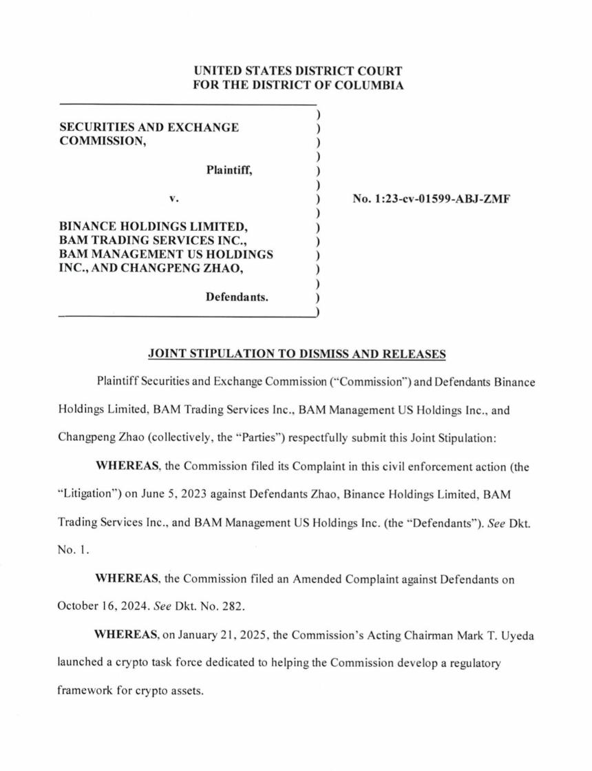 SEC与币安达成协议,两年后撤销诉讼 币圈网报道: 据埃莉诺·特雷特 (Eleanor Terrett) 报道,美国证券交易委员会 (SEC) 和币安已提交一份联合协议,寻求撤销针对该交易所的持续诉讼。 SEC和币安案法庭文件摘录。来源:Eleanor Terrett 特雷特通过她的X页面分享了这一消息,并附上了法律文件中的图片,其中指...