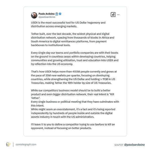 Tether为何抵制欧盟MiCA法规:监管冲突与未来展望 摘要 Tether 对 MiCA 法规有独特的看法,包括首席执行官 Paolo Ardoino 在内的高管,解释了为何不愿与 MiCA 法规有任何瓜葛,他们认为该法规 。 币圈网报道: 原文标题:《Why Tether refuses to comply with MiCA》 撰文:Bradley ...