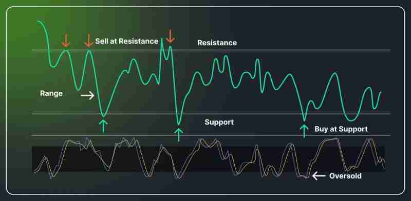 定义:区间交易是一种加密货币价格在特定高点和低点之间波动的策略。交易者在低点(支撑位)附近买入,在高点(阻力位)附近卖出,从区间波动中获利。