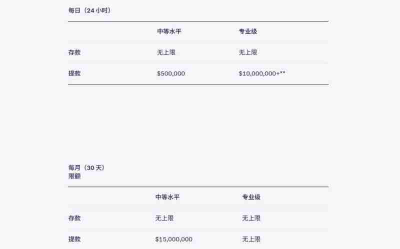 中等水平法定货币每日限额为100,000美元,每月限额为500,000美元;专业级法定货币每日限额为10,000,000+**美元,每月则没有限额。