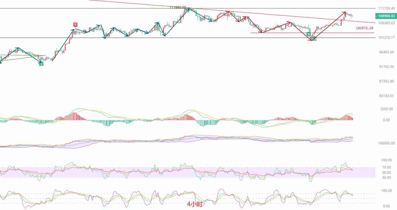 四小时K线在冲击11万美元后开始回落,关注EMA15第一支撑108000美元,和第二支撑106700美元。MACD连续放量梯量下行,DIF和DEA高位收缩,短线存在回调需求。布林带上轨来到110500美元。按照目前趋势,本周行情基本已到节点,接下来可能进入高位盘整阶段。第一浪回踩拉升已经完成,接下来可能出现第二浪回踩拉升加清算。因此,本次南下的入场点不在11万美元,而是在突破历史高点后再寻找机会。短期内,思路以回踩支撑做多为主,持仓周期不宜过长,获利空间也不要过于贪婪。