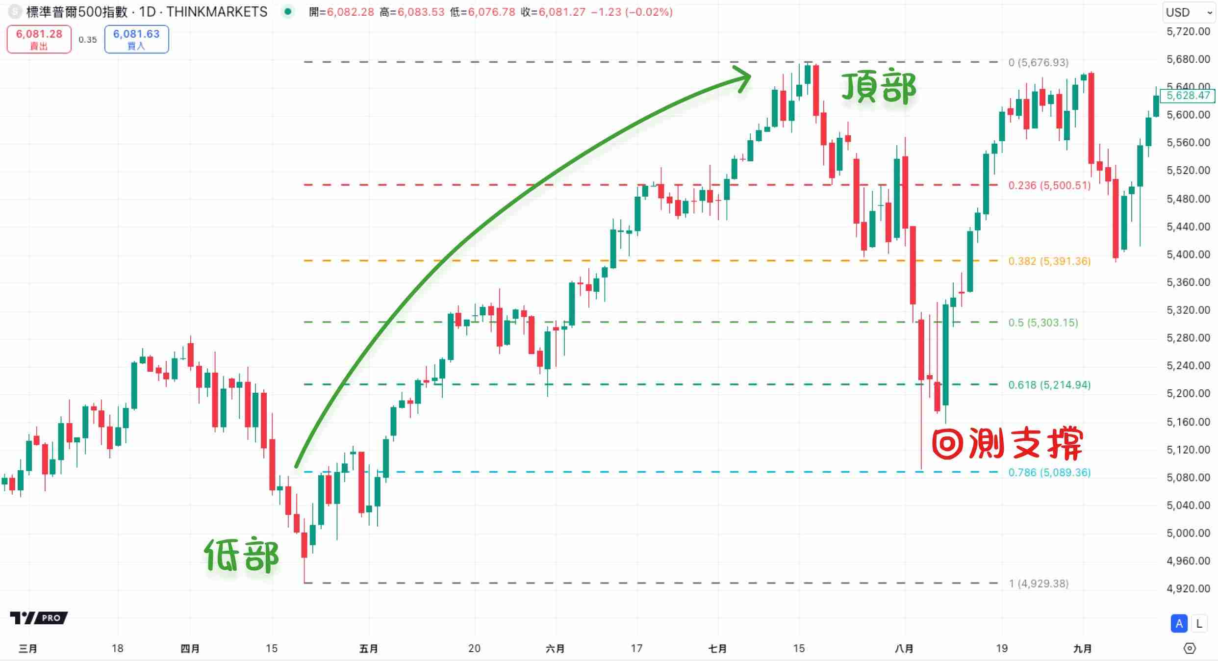 - 0.382:代表回测约38.2%,常见的回调区域之一,适合关注可能的支撑或阻力。