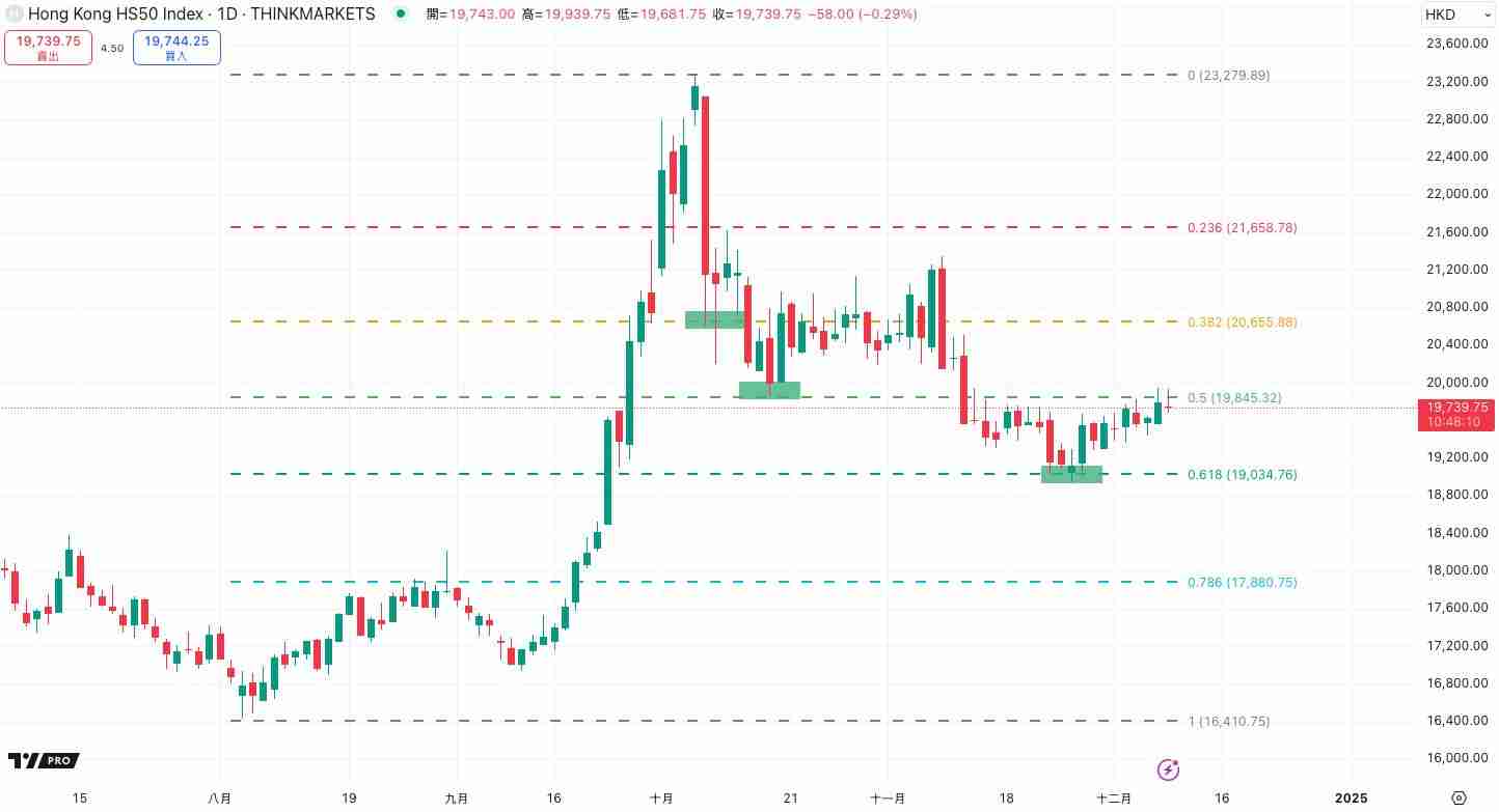 在跌破了0.382的支撑后,恒生指数往下试探0.5的支撑位,随后在0.5的支撑位迅速反弹。