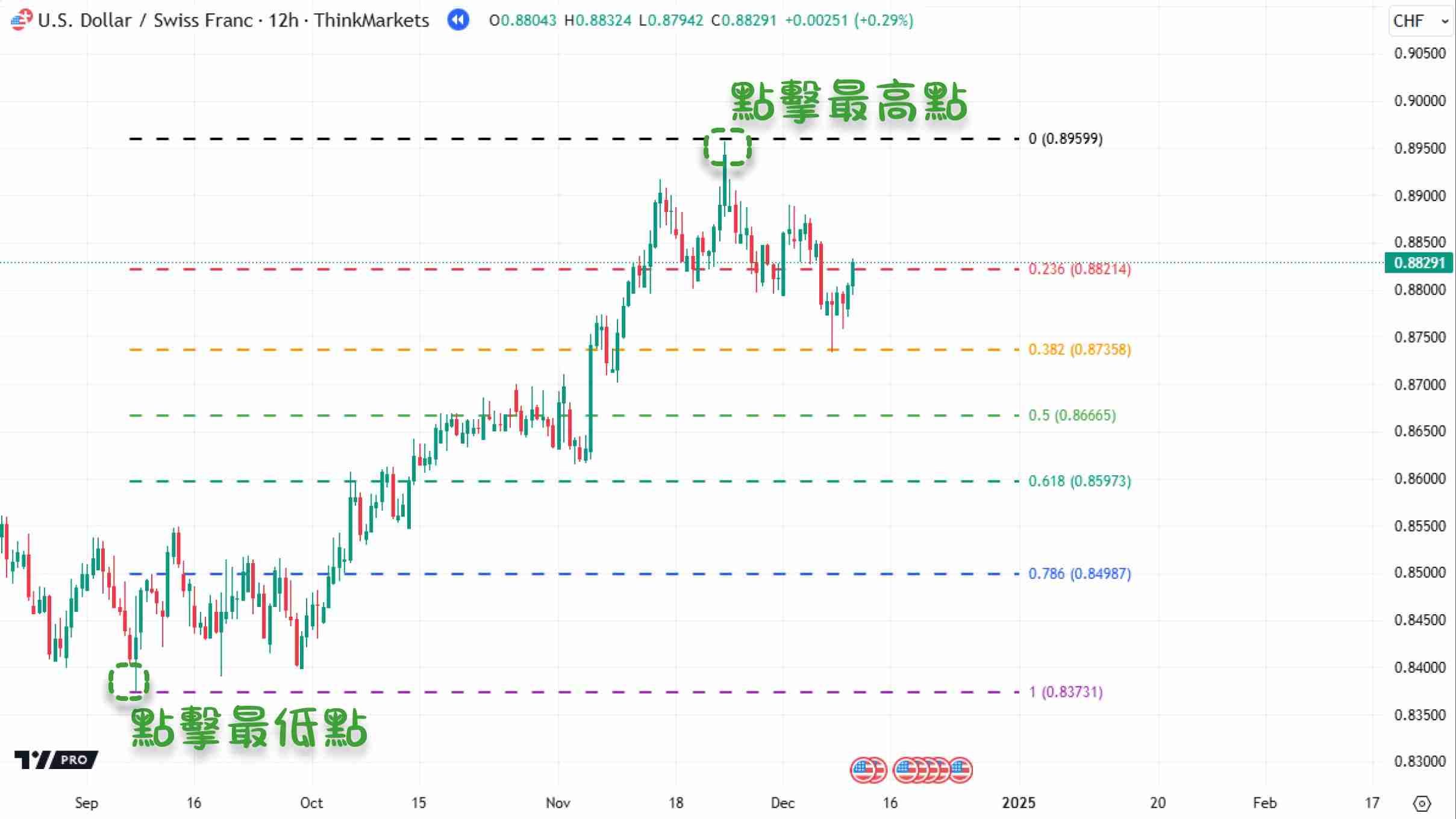 以上图为例,美元兑瑞士法郎出现了明显的上升趋势。在出现回调后,我们需要从图表中迅速找出趋势的高低点。因此,我们从9月6日的低点0.8374开始绘制,一直到11月22日的高点0.8957。
