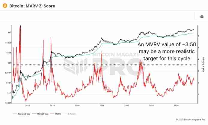 图2:MVRV比率视图预测周期仍有进一步增长空间,达到历史4+甚至更保守的3.5目标值
