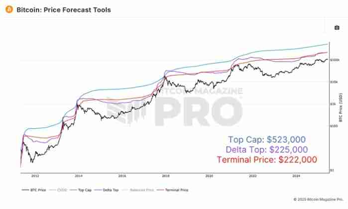 我们首先来看《比特币杂志专业版》提供的免费价格预测工具,这些工具汇集了多个历史上较为准确的估值模型。虽然基于数据的反应通常比盲目预测价格更有效,但研究这些指标仍能为市场行为提供强有力的背景参考。当宏观经济、衍生品和链上数据开始发出警告信号时,通常是获利了结的好时机,无论是否达到某个具体价格目标。尽管如此,探索这些估值工具依然具有指导意义,并能在结合更广泛市场分析时辅助战略决策。
