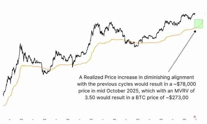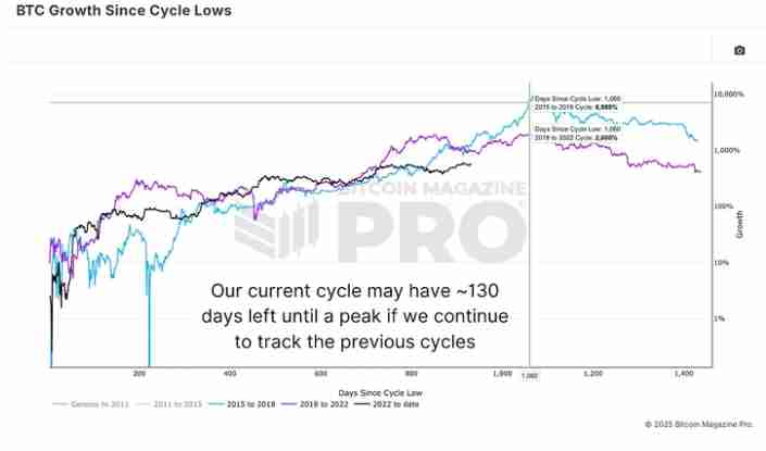 时机与估值同样重要。通过分析“自周期低点以来的BTC增长”,我们发现前几轮比特币周期在距低点约1060天时达到顶峰。目前我们处于本周期约930天。如果这一模式持续,峰值可能在约130天后到来。历史上,FOMO(恐惧错过)驱动的价格上涨通常发生在周期末期,导致实现价格(投资者平均成本基础的代理指标)迅速上升。例如,2017年最后130天,实现价格增长了260%;2021年增长了130%。假设由于回报递减,增长率再减半,从当前4.7万美元的实现价格增长65%,到10月18日可能达到约7.8万美元。