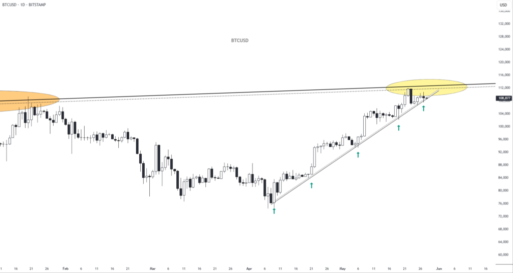 比特币在11.2万美元附近遇阻 但上升趋势线仍有效 下面小编就为大家分享一篇比特币在11.2万美元附近遇阻 但上升趋势线仍有效,具有很好的参考价值,希望对大家有所帮助。 比特币交易价格接近10.9万美元,11.2万美元处存在阻力位,而10万美元附近的趋势线支撑预示着价格可能即将发生变化。比特币(BTC)近期持续在图表标注的关键阻力位承压。日线级别的价...