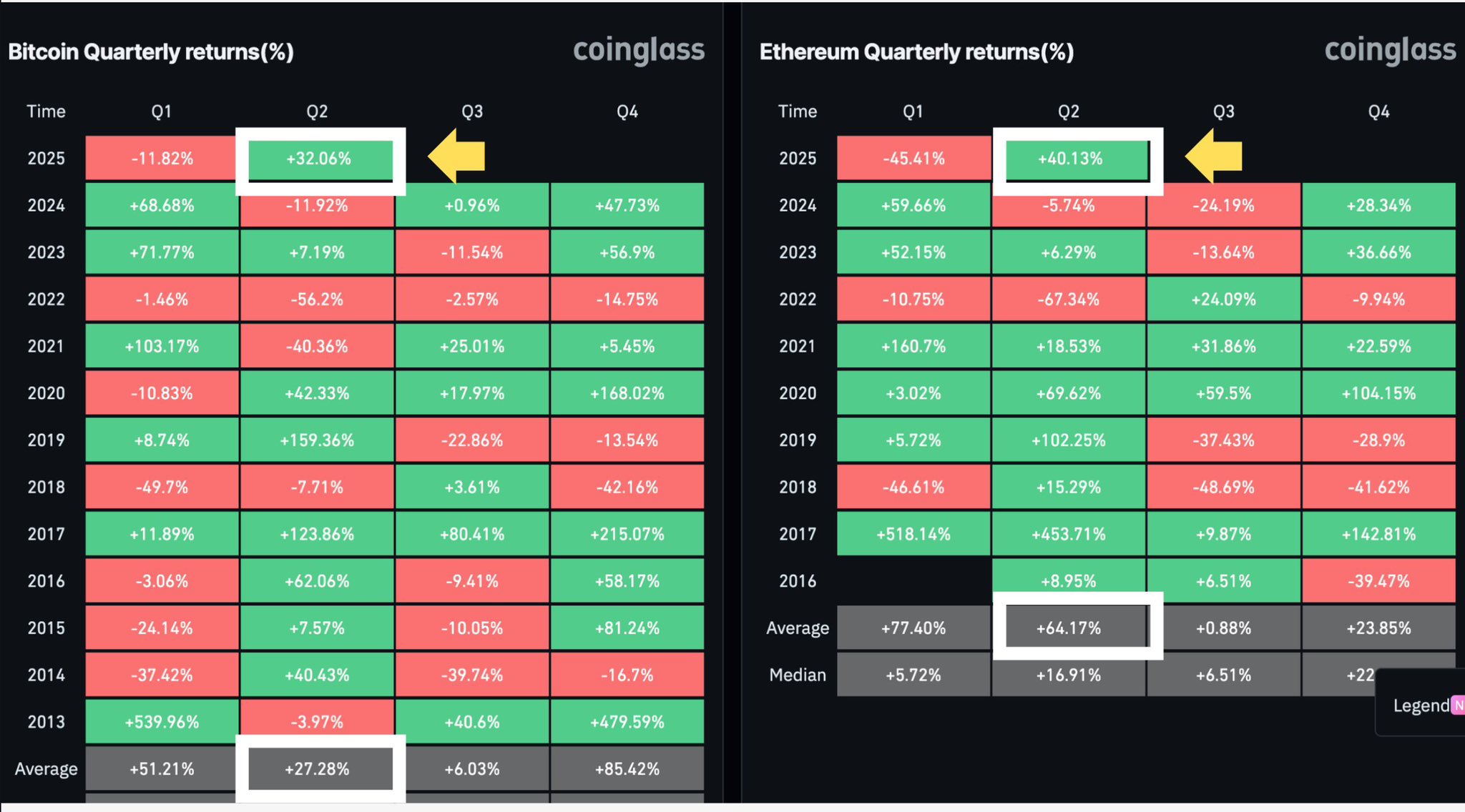 2025年第二季度以太坊表现超越比特币 下面小编就为大家分享一篇2025年第二季度以太坊表现超越比特币,具有很好的参考价值,希望对大家有所帮助。 以太坊(ETH)在2025年第二季度的涨幅表现超越了比特币(BTC)。根据Ash Crypto在X平台发布的帖子,这一领先的替代币在此期间实现了40.13%的涨幅,而龙头加密货币比特币的涨幅为3...