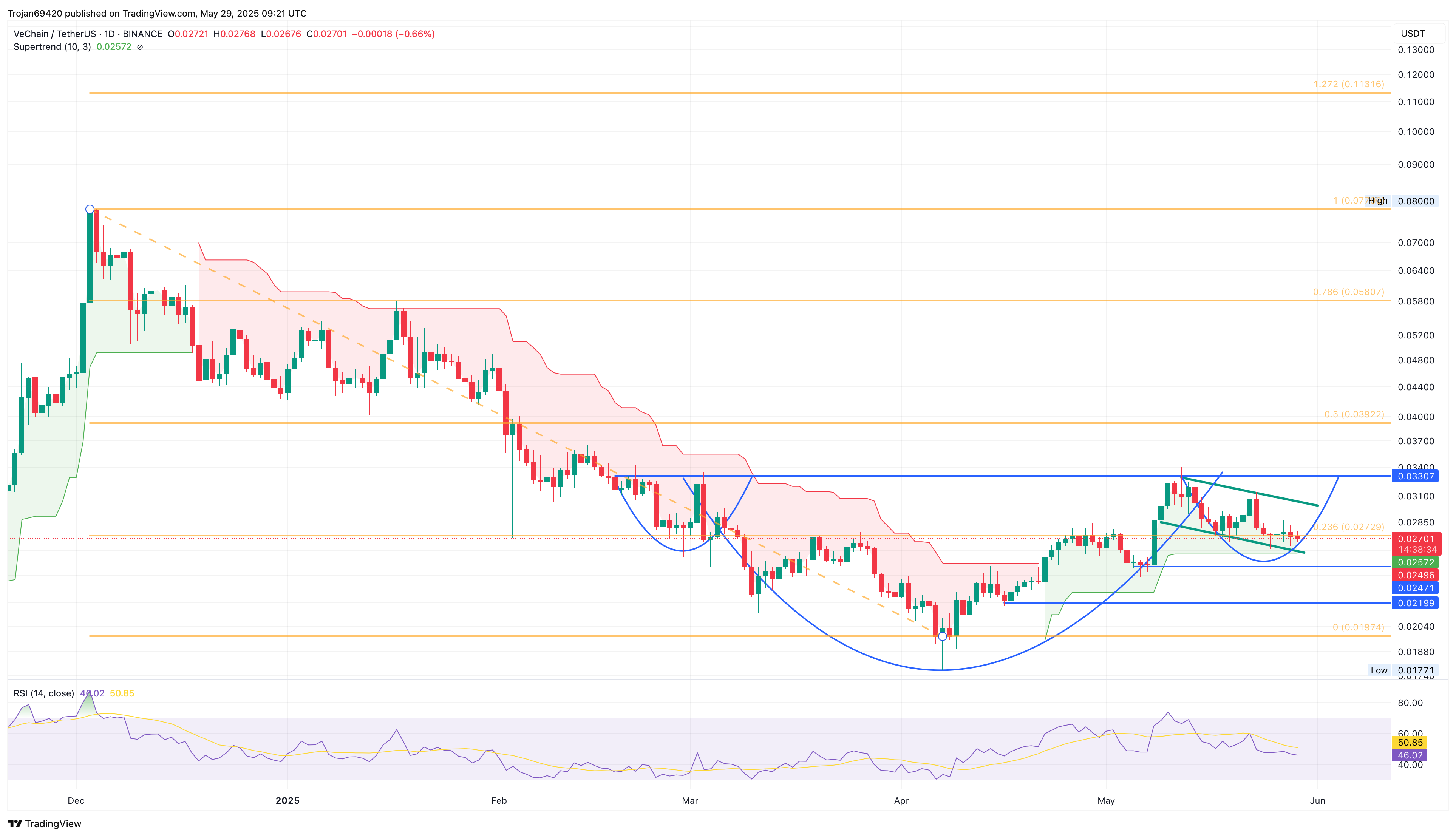 唯链价格跌破0.027美元:看涨模式面临风险? 下面小编就为大家分享一篇唯链价格跌破0.027美元:看涨模式面临风险?,具有很好的参考价值,希望对大家有所帮助。 唯链价格已跌破0.027美元支撑位,可能导致看涨的头肩底形态失效。趋势会逆转还是继续深度回调?尽管以太坊突破2700美元后山寨币普遍上涨,唯链却未能受益于市场整体回暖。日内近1%的回调使...