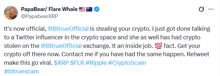 据报道,XRP投资者在Bitrue上损失数千枚代币,指控有内部人员参与 下面小编就为大家分享一篇据报道,XRP投资者在Bitrue上损失数千枚代币,指控有内部人员参与,具有很好的参考价值,希望对大家有所帮助。 近期一则指控新加坡加密货币交易所Bitrue窃取用户资产的报告在XRP社区引发轩然大波。知名XRP和Flare社区意见领袖"PapaBear"周二发起对Bitru...