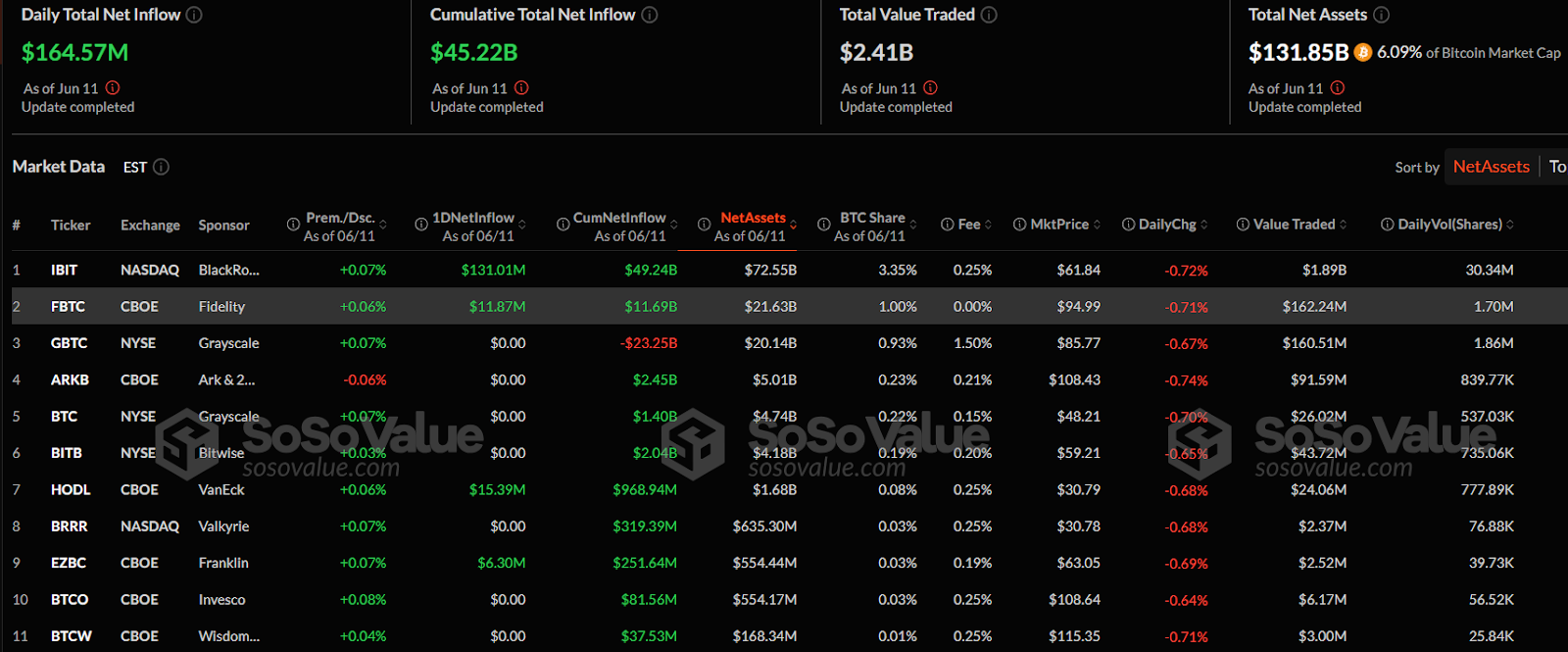 现货比特币ETF录得1.6457亿美元资金流入,三日累计流入额达452.2亿美元 下面小编就为大家分享一篇现货比特币ETF录得1.6457亿美元资金流入,三日累计流入额达452.2亿美元,具有很好的参考价值,希望对大家有所帮助。 现货比特币ETF于6月11日录得1.6457亿美元资金流入,连续三日保持净流入态势,总净资产规模达1318.5亿美元(占比特币总市值6.09%),当日总...