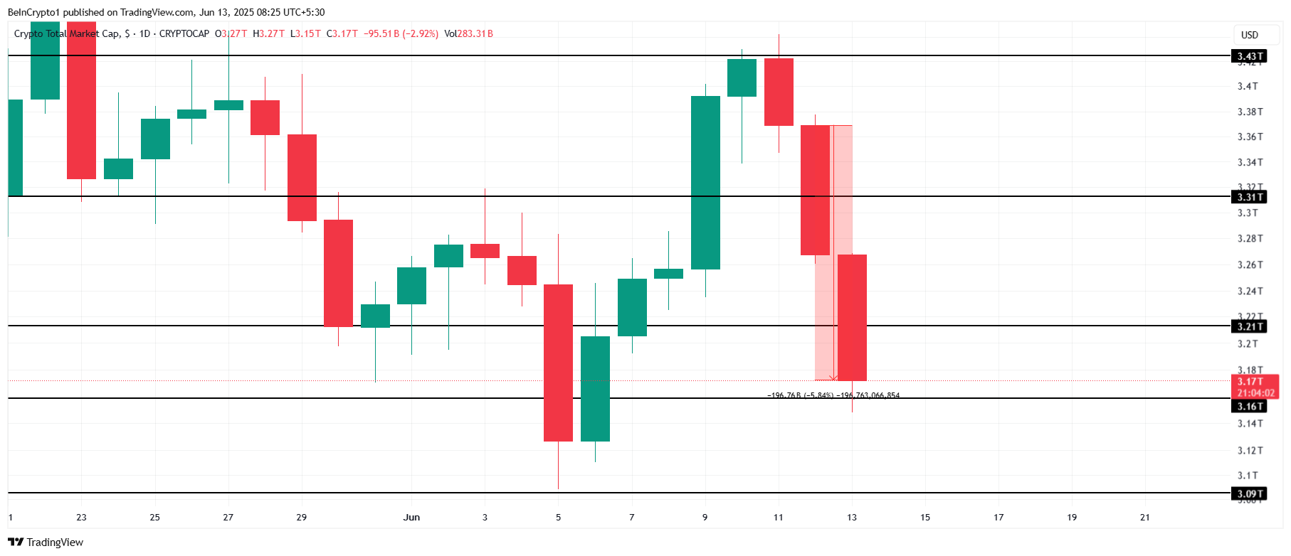 为什么今天加密货币市场下跌? 下面小编就为大家分享一篇为什么今天加密货币市场下跌?,具有很好的参考价值,希望对大家有所帮助。 加密货币总市值(TOTAL)暴跌逾1960亿美元,比特币(BTC)现报103500美元。随着周五以色列袭击伊朗,中东紧张局势升级正在冲击全球股市。山寨币中,Ethena(ENA)成为最大输家,跌幅达18%...