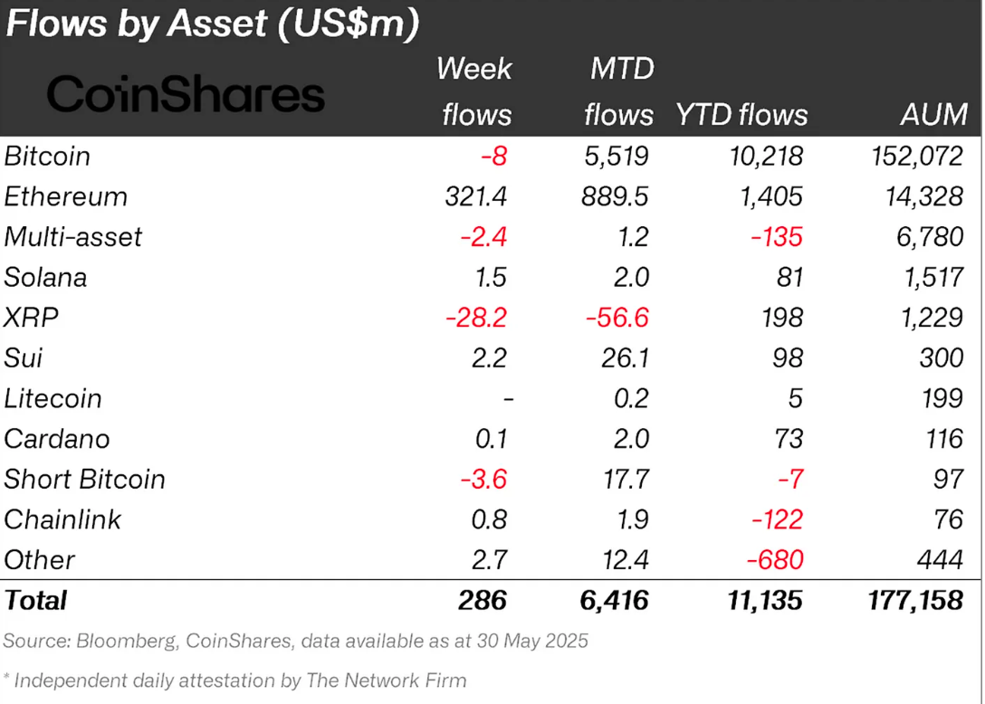 比特币停滞不前,以太坊引领2.86亿美元周加密货币投资流入 下面小编就为大家分享一篇比特币停滞不前,以太坊引领2.86亿美元周加密货币投资流入,具有很好的参考价值,希望对大家有所帮助。 比特币停滞不前,XRP再度遇阻,以太坊意外引领加密货币投资基金流入,累计周流入超3亿美元。CoinShares研究主管James Butterfill周一在博客文章中披露了加...