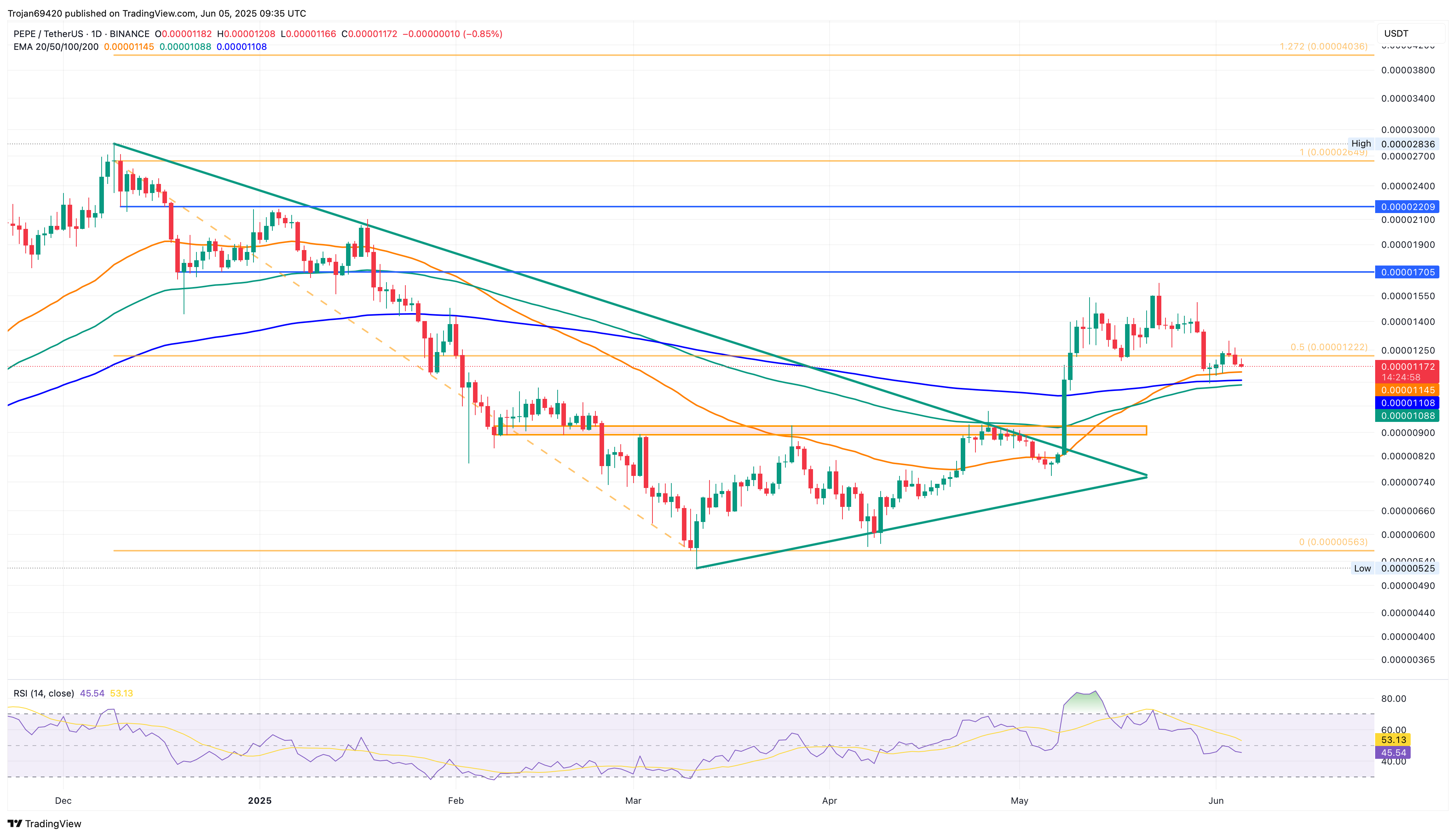 PEPE能否守住0.00001108美元?空头占据主导 下面小编就为大家分享一篇PEPE能否守住0.00001108美元?空头占据主导,具有很好的参考价值,希望对大家有所帮助。 随着空头势头增强,PEPE面临回调至0.000010美元风险,尽管大额持有者持续增持。0.00001108美元支撑位能否守住?当迷因币跟随比特币回调之际,佩佩币在日益增强的看跌压...