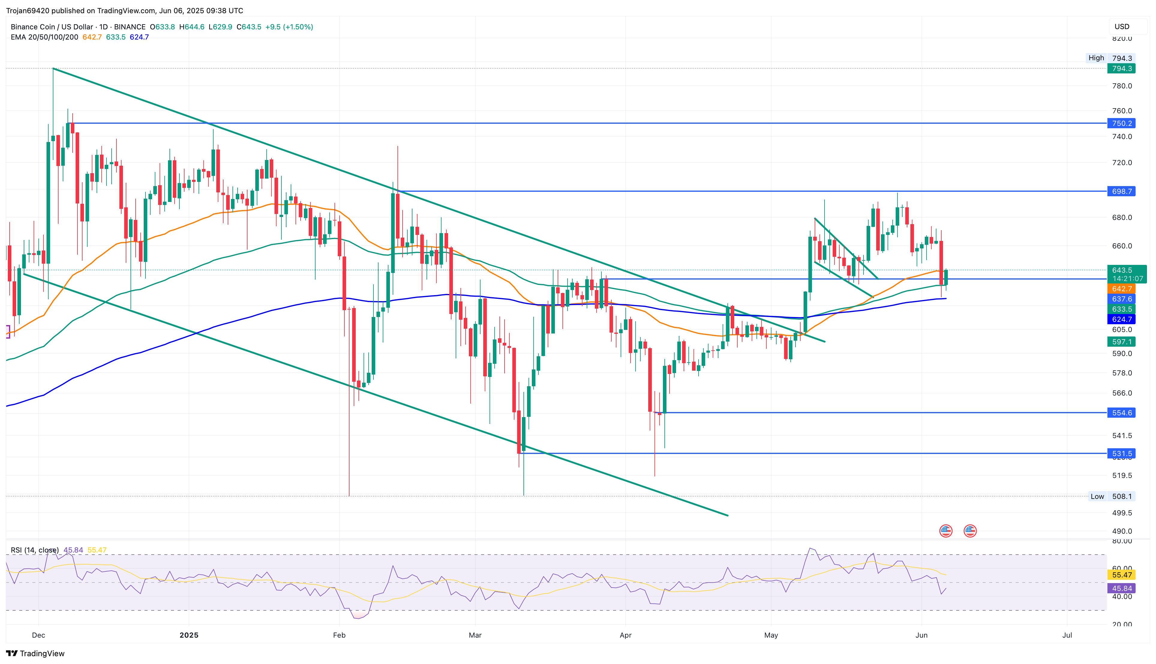 币安币显现复苏迹象:能否冲击700美元? 下面小编就为大家分享一篇币安币显现复苏迹象:能否冲击700美元?,具有很好的参考价值,希望对大家有所帮助。 币安币(BNB)在市场暴跌后出现短暂复苏,现以644美元价格站上100日均线。这股动能能否推动BNB冲击700美元,还是会引发更深度的回调?在加密货币市场经历大规模抛售后,币安币周五反弹近2%...