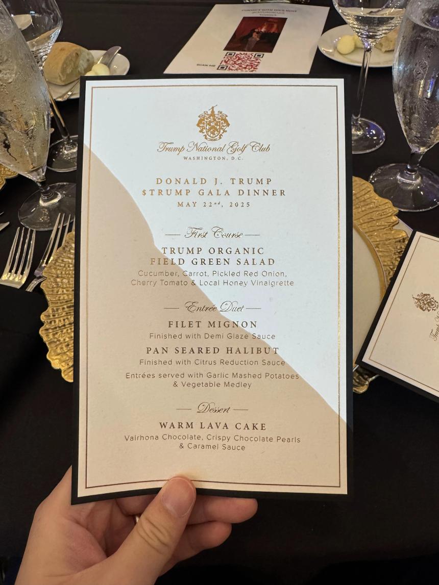 Sheldon:整个会场“特朗普”元素还是很多的,有非常强的个人 IP 效应:现场有很多特朗普标志性的“FIGHT”立牌,还有一个签名版可以给大家签名;喝的酒是“Trump”品牌,吃的牛排以及蔬菜也是“Trump Organic”(特朗普有机食品),这次宴会的庄园也是特朗普旗下的。