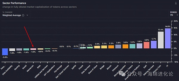 尽管 memecoin 上月曾上涨 17.6%,位列表现第六好的类别,但目前已明显落后。