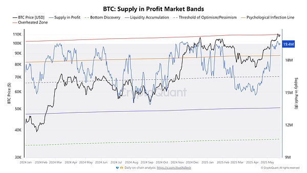 盈利市场区间供应量指标追踪的是当前流通的比特币供应量中有多少处于盈利状态。截至2025年5月下旬,这一数字已飙升至1940万枚比特币,接近历史极值,并进入“过热区”。此前,比特币价格曾在2025年12月17日测试过该区域,随后价格从10.7万美元回调至9.3万美元。