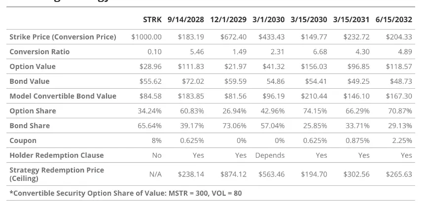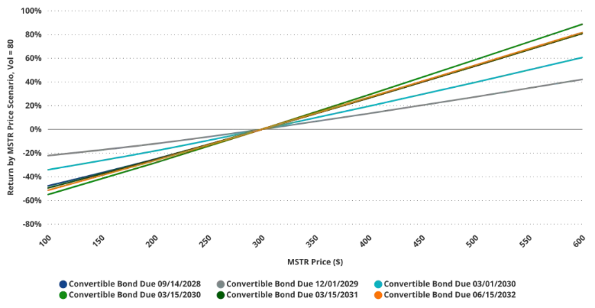 2030 年 3 月 15 日的可转换债券因其较大的期权成分对 MSTR 价格最具杠杆效应