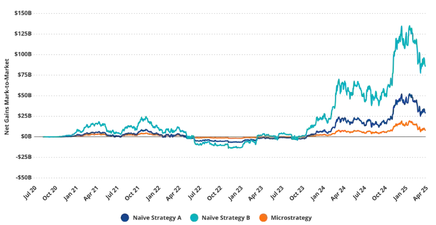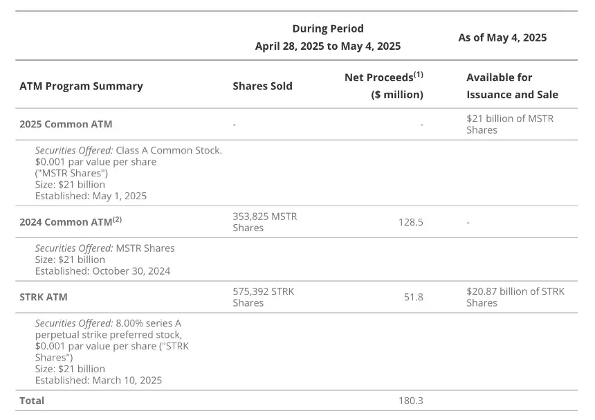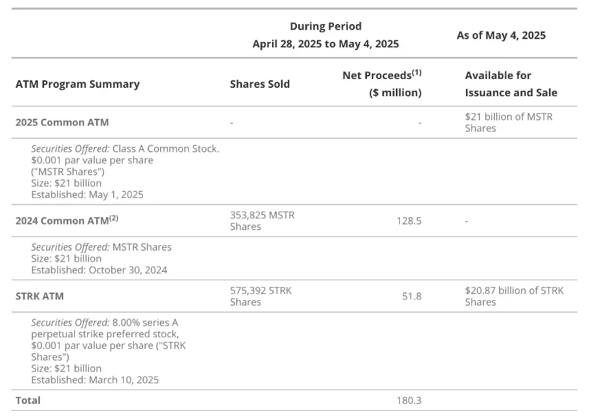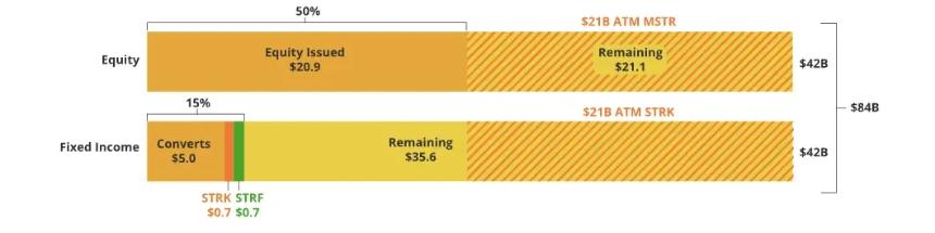 得益于 21/21 计划启动后前所未有的加密牛市,截至 2025 年 5 月,Strategy 已通过其“按市价发行”(ATM)计划出售了全部 210 亿美元的 MSTR 股票。在固定收益部分,Saylor 已出售了 50 亿美元的可转换债券、 8.75 亿美元的 STRK 可转换优先股,以及 8.5 亿美元的不可转换优先股。在 2025 年 5 月 1 日的财报电话会议上,该公司宣布将融资计划扩展至 840 亿美元,其中包括新增的 210 亿美元 MSTR ATM 计划、现有的 210 亿美元 STRK ATM,以及新增的 140 亿美元可转换债务发行。