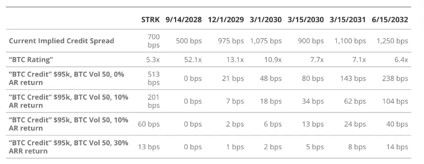 我们认为,STRK 的几个结构性特点带来了显著的下行风险,但没有相应的上行潜力。这些特点包括较弱的比特币支撑能力、暂停股息的可能性以及债券中较小的期权部分。此外,STRK 的信用利差重新评级带来的价格上涨空间也非常有限。