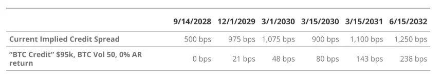 Saylor 将“BTC 评级”与期权定价模型结合使用,通过当前 BTC 价格和波动性,计算 BTC 价格低于清算价格的概率,从而确保债券持有人不会遭受损失。他将这一计算概率称为“BTC 风险”,并将其输入债券定价模型,生成一个新的“信用利差”,他称之为“BTC 信用”(BTC Credit)。正如上表所示,Saylor 认为市场对每只债券的违约概率估计过高,导致这些债券的交易价格低于“合理”评估后的价格。