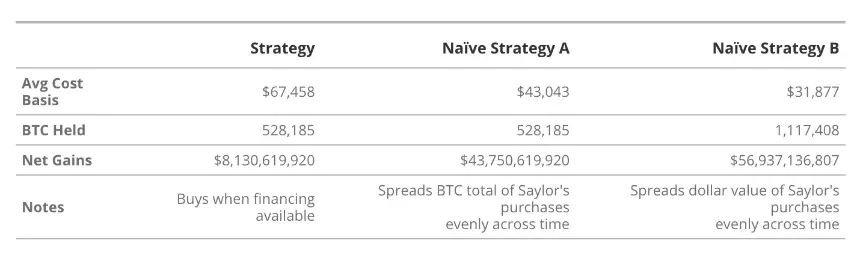 Strategy 在局部高点购买比特币(BTC)相较于其他策略会产生“损失”,因为这导致其 BTC 的平均购买价格高于随机购买的情况。至于 Strategy 的购买是否是导致这些局部“高点和低点”的原因,则是另一个问题。不管怎样,与一种“天真”的、随机实施的 BTC 购买策略相比,这种在局部高点买入的策略对股东来说是一种损失。但另一方面,由于 MSTR 的“正凸性”(positive convexity),比特币价格的变化会导致每股 BTC 的美元价值显著增加,而新的融资也会使每股持有的 BTC 数量增加。因此,投资者会随着 BTC 价格的上涨而获得更大的 BTC 敞口。