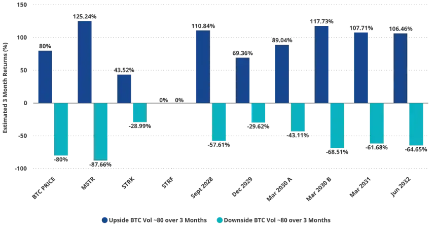 可转债证券增加了灵活性但也加剧了风险:MSTR 的可转债和优先股(尤其是 STRK 和 STRF)提供了不同水平的收益和 BTC 敞口,但同时也带来了复杂性、不对称下行风险以及对波动性的敏感性。其中, 2030 年 3 月 15 日到期的可转债对 MSTR 的敞口最大,但即便是这些工具也高度依赖于 BTC 的表现以及溢价的持续性。