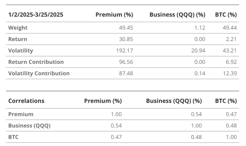 MSTR 独特的动态使其 30 天历史波动率飙升至 ~ 113% ,远高于比特币的 ~ 55% 。总的来说,MSTR 股票为投资者提供了便捷的途径,通过公开交易的股票市场获得杠杆化的比特币敞口。溢价是 MSTR 股票波动性和表现的主要贡献者。通过分解 MSTR 组合(比特币 + 核心业务 + 溢价)的权重、相关性和波动性,我们发现溢价对总收益的贡献达到了 96.5% ,而对波动性的贡献约为 87.5% 。