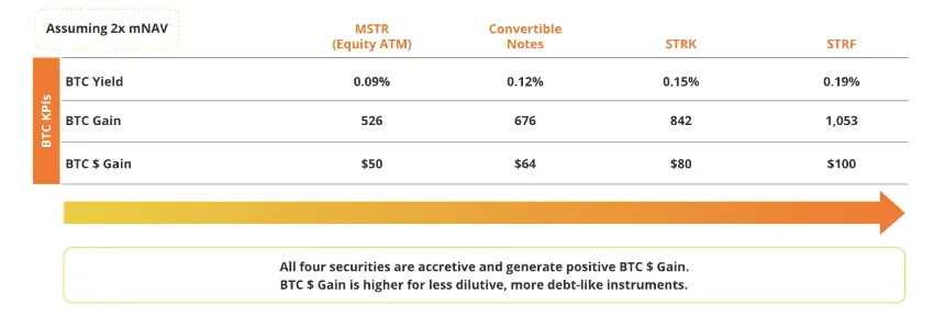 不同证券形式下 1 亿美元发行的比特币关键绩效指标(BTC KPIs)示例