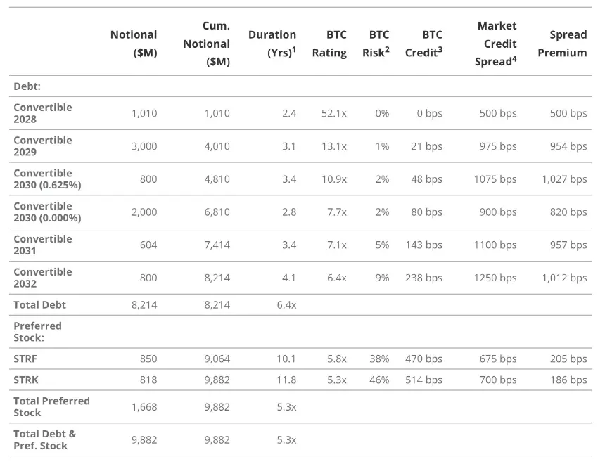 Saylor 使用期权定价模型对 Strategy 的可转换债券进行自己的分析,以证明这些债券因抵押物价值未被充分考虑而被低估。他提出了“BTC 评级”(BTC Rating)和“BTC 风险”(BTC Risk)的概念,用以描述 Strategy 债务的潜在风险。“BTC 评级”是当前 BTC 市场价格下,比特币持有量对债券面值的倍数。该指标适用于所有债券,并根据 Strategy 比特币持有量清算时的优先级进行调整。例如, 2028 年 9 月 14 日的债券的 BTC 评级为 52.1 倍,这意味着按当前 BTC 价格计算,Strategy 的 BTC 价值是该债券面值的 52.1 倍。