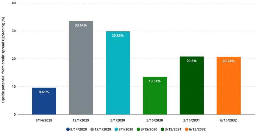 来源:彭博社和 Kynex。假设借贷成本为 0.50% ,波动率为 60% ,以计算可转换债券的信用利差;假设 STRK 中嵌入的看涨期权价值为 200 个基点。