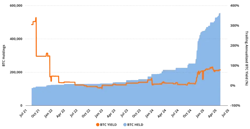 Strategy 的金融工程通过增加债务和股份,为每股普通股带来了更多的 BTC 敞口。这是因为 Strategy 的核心目标是增加普通股对 BTC 价格的敞口。Saylor 将每股 BTC 数量的增加称为“BTC 收益”(BTC Yield)。这一关键绩效指标(KPI)通过比较不同时期每股普通股对应的 BTC 持有量来计算。截至 2025 年 5 月,年初至今的 BTC 收益约为 14% (基于已发行普通股),完全稀释基础下约为 13% 。Strategy 在 2025 年的最低 BTC 收益目标为 25% 。这意味着每 1, 000 股 MSTR 普通股对应的 BTC 数量将从 2025 年 5 月 8 日的约 1.79 BTC 增加到年底的约 1.99 BTC。