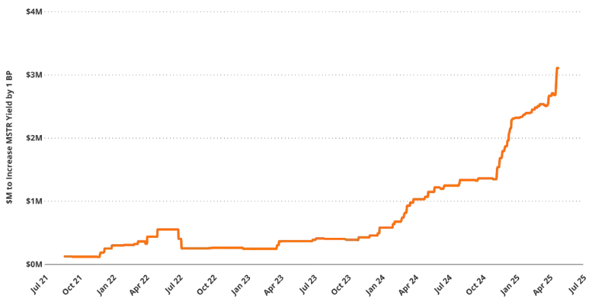 例如, 2021 年 8 月,MicroStrategy 只需要 2.6 BTC 就能产生一个基点的比特币收益。而到 2025 年 5 月,这一数字已飙升至 58 BTC。从资金角度看,为实现同单位收益所需的资金从约 12.6 万美元增加到 550 万美元。这反映了一种基本的数学现实:随着 Strategy 的比特币基数增长,每新增的 BTC 对收益的边际贡献减少,而产生收益所需的资金则呈指数增长。这种复合性低效导致了可持续收益的上限不断下降。