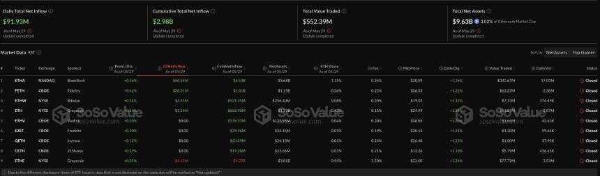 随着市场看涨复苏的可能性不断增加,机构投资者对以太坊的支持也日益增强。5 月 29 日,以太坊 ETF 的日净流入总额达 9193 万美元。