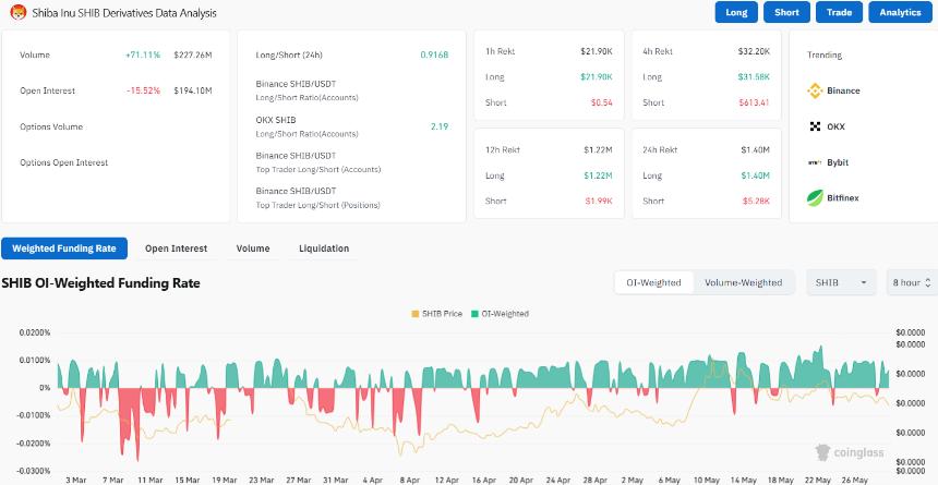 Shiba Inu 衍生品数据显示,价格波动期间交易活动出现显著变化。交易量激增 71.11%,达到 2.2726 亿美元,表明市场兴趣日益浓厚。