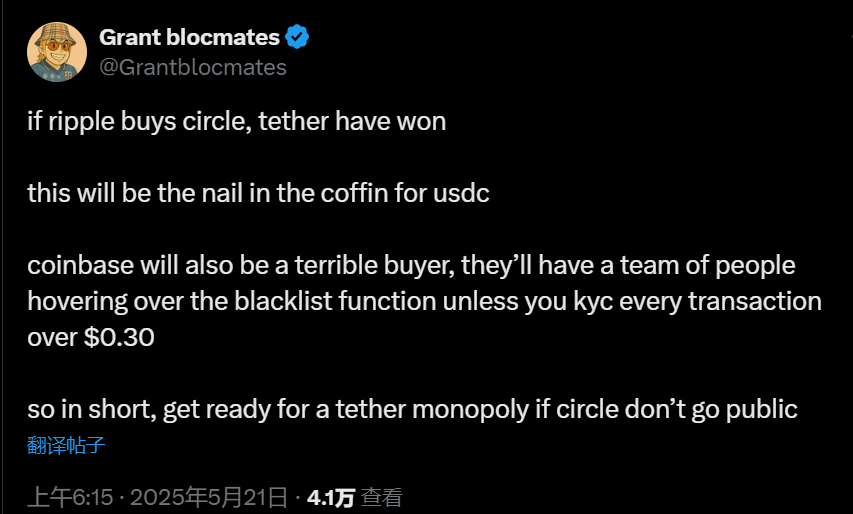 社区对此展开广泛讨论。有人认为,若Ripple收购Circle,可能会对USDC造成负面影响,甚至让Tether(USDT)占据更多市场份额。还有人猜测,Circle是否在利用Coinbase与Ripple之间的竞争抬高价格,基于两者在2018年共同创立Centre Consortium的历史关系。