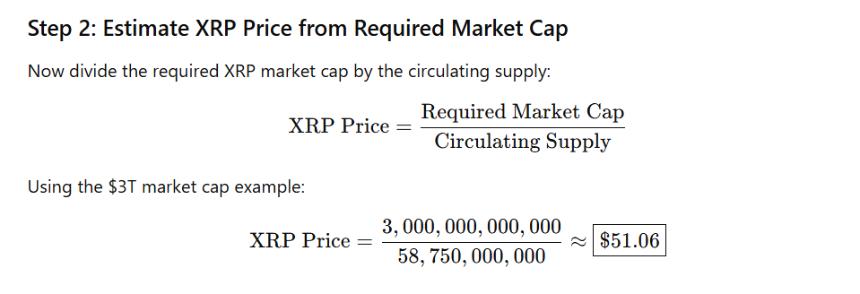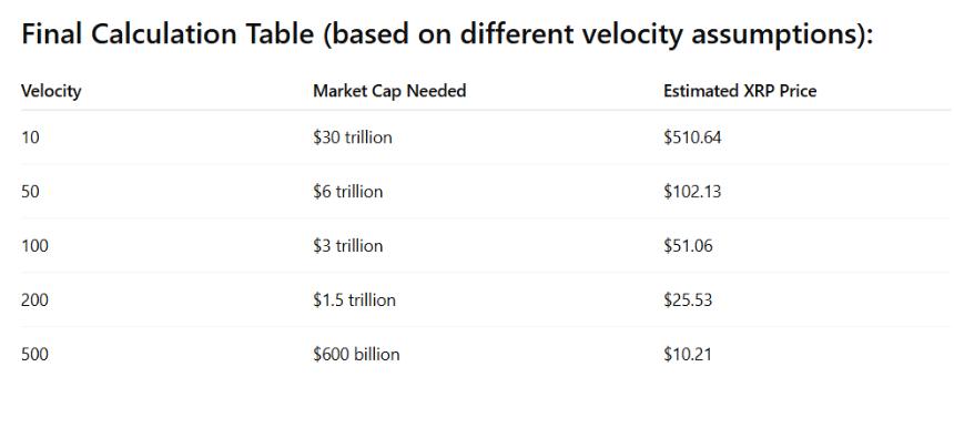 本质上,为了估算 XRP 的潜在价值,ChatGPT 首先研究了每年处理 300 万亿美元所需的 XRP 数量。他们使用了一个简单的公式:总交易量除以流通速度。例如,如果每个 XRP 代币曾是每年重复使用 100 次,网络只需要价值 3 万亿美元的 XRP 即可处理全部 300 万亿美元。