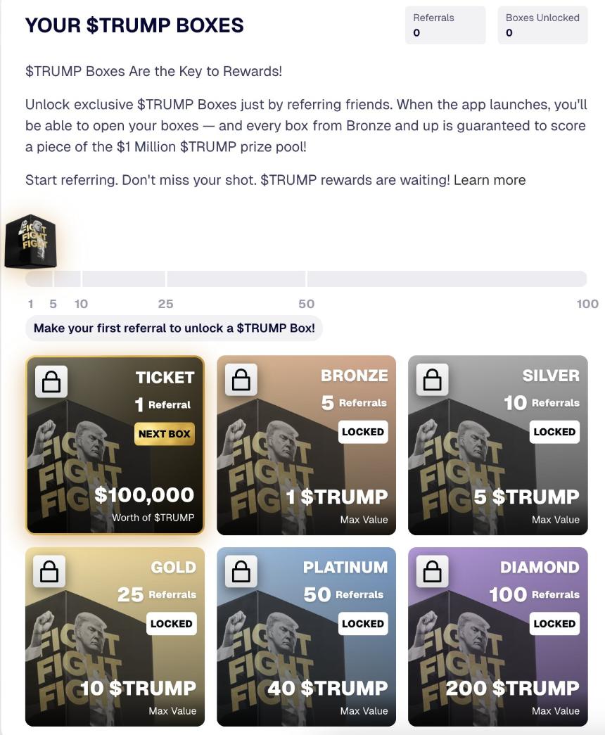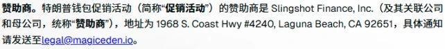在Trumpwallet.com官网的条款细则中,也明确指出该钱包服务由Magic Eden提供,并提到注册钱包用户可参与抽取10万个$TRUMP代币的促销活动,而这一活动由Slingshot Finance赞助。