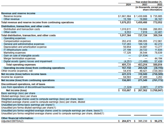 招股书数据显示,Circle在2024年的总收入为16.76亿美元,其中99.1%来自USDC储备资产产生的利息收入。然而,净收入仅为1.56亿美元,主要原因是高额的发行成本,尤其是对大型交易所的依赖。例如,Coinbase占据了Circle收入的54.18%,而与币安的合作也涉及一次性支付6025万美元。