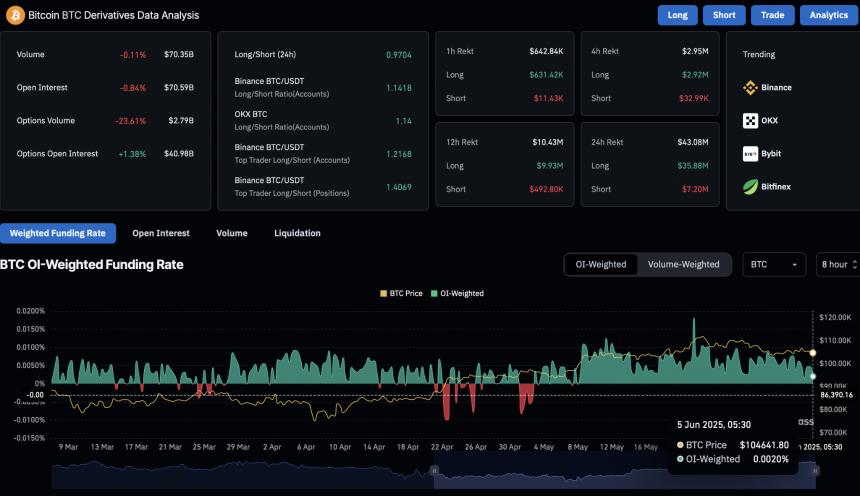随着比特币现货价格回落,CoinGlass数据显示,未平仓合约下跌0.84%,目前为705.9亿美元。过去24小时内,衍生品交易员的兴趣下降导致多头仓位清算达3588万美元,而空头仓位清算则限制在720万美元。