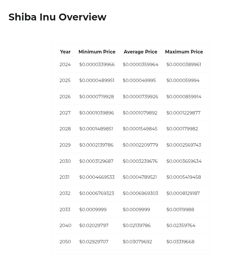 更远到 2035 年,他们思考代币可能翱翔至 0.00216 美元,这将是收益超过17,900%。他们对2050年柴犬价格的预测达到了令人瞠目的1.06美元,标志着柴犬价格将达到1美元的水平。要达到这一水平,柴犬价格需要上涨超过8,833,233%。